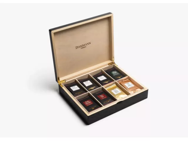 Ervaar een verfijnde theeproeverij met de luxe zwarte theedoos van Dammann Frères. Deze elegante houten theedoos, afgewerkt met een messing plaat op het deksel en een natuurlijke houten binnenkant, bevat 8 zorgvuldig geselecteerde theesoorten die je smaakpapillen zullen prikkelen.